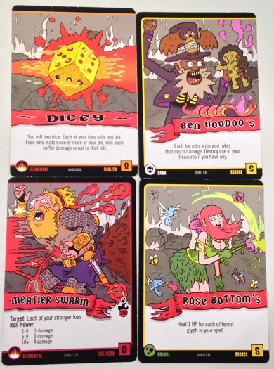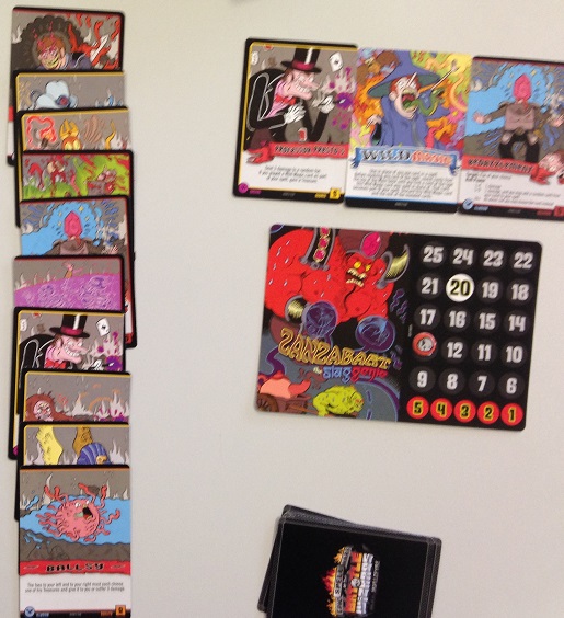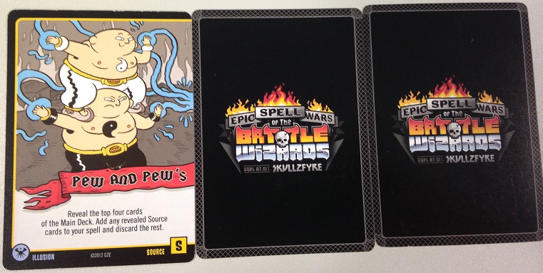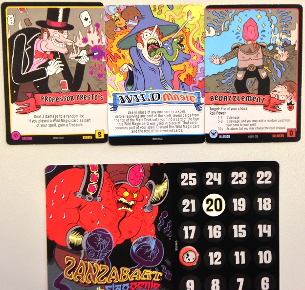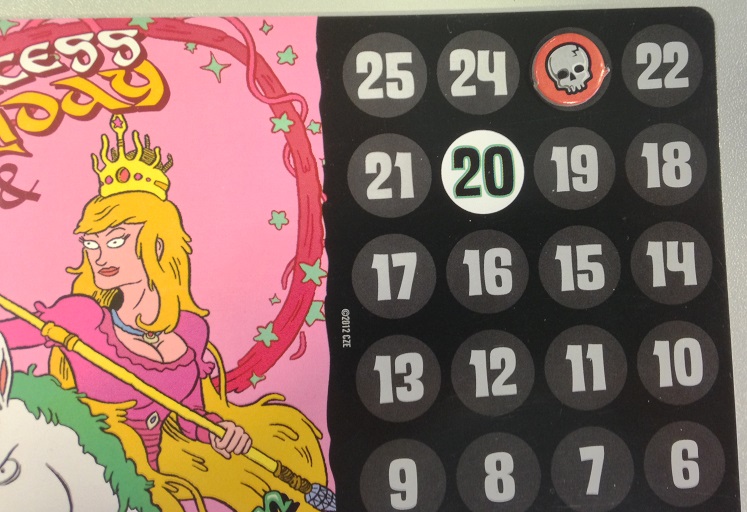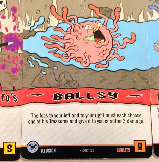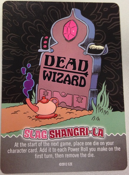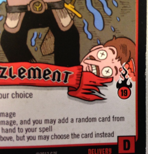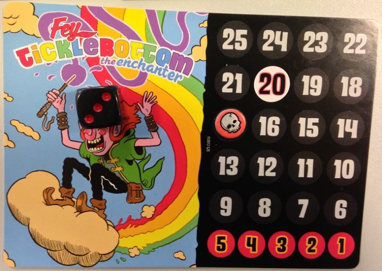 Wo wir schon bei der Sprache sind, das englisch ist sehr gut verständlich und bis auf ein paar wenige, nicht aus der Schule geläufigen Vokabeln sehr gut zu meistern. Bisher musste zumindest niemand mit einem Wörterbuch da sitzen und die Karten Schritt für Schritt übersetzen. Somit ist auch diese Hürde schön gering. Doch diese muss wohl genommen werden. Ich glaube nicht, dass sich ein deutscher Verlag das Spiel ins Programm nehmen wird. Dafür ist der Humor von Epic Spell Wars zu pechschwarz und die Bilder… naja… sagen wir mal zu wenig delikat.