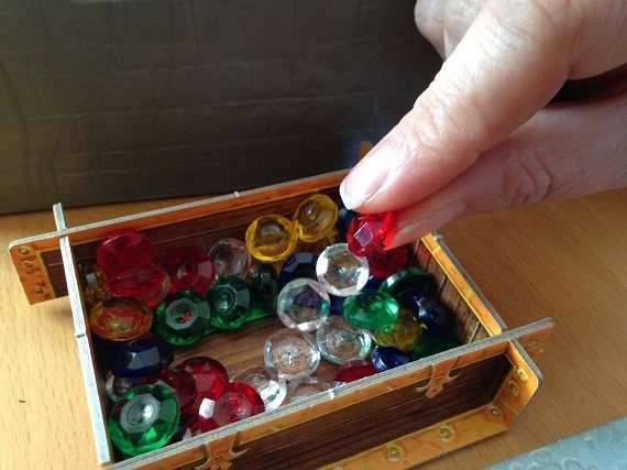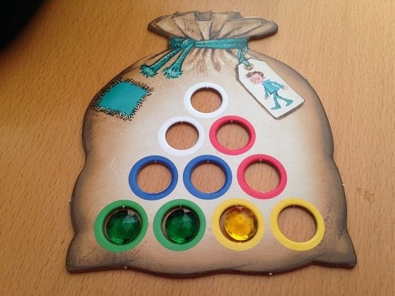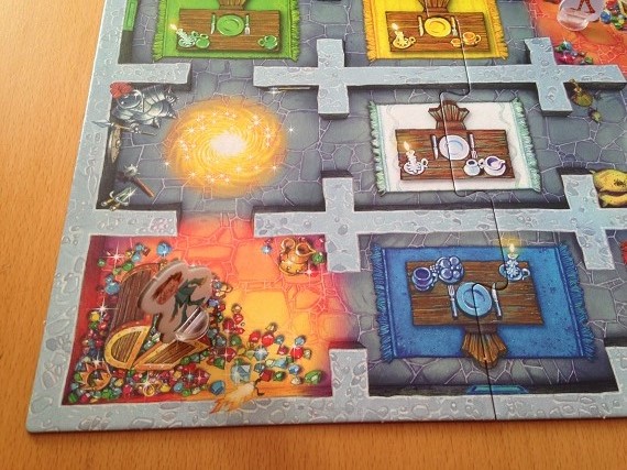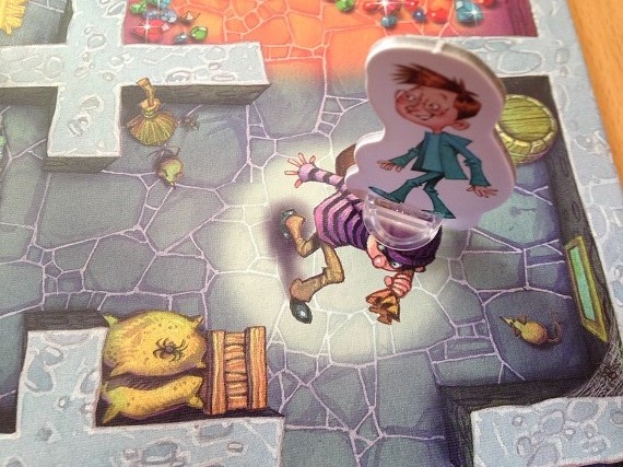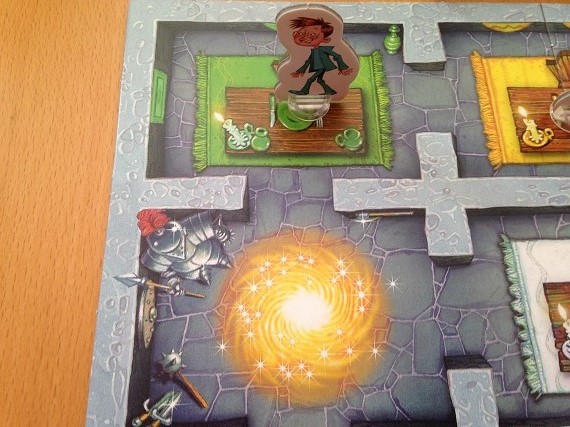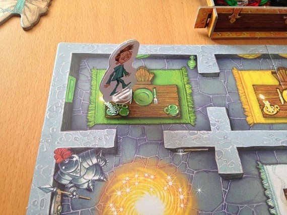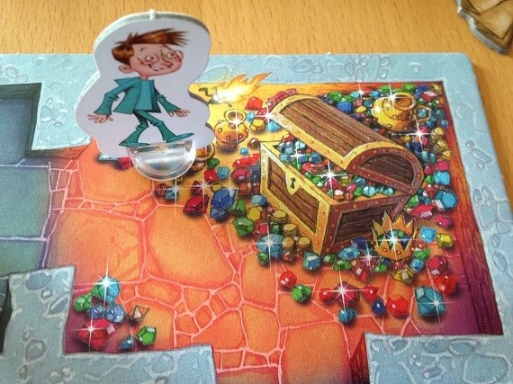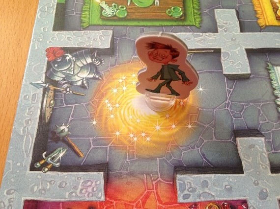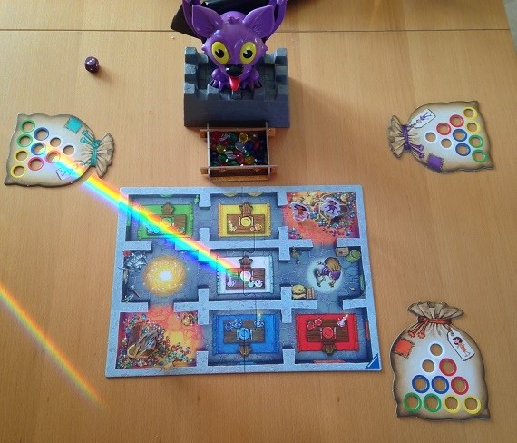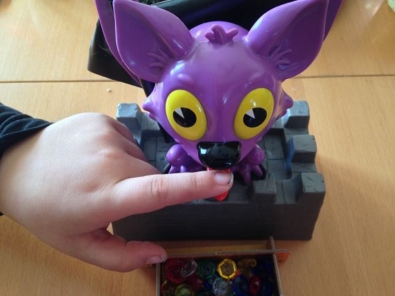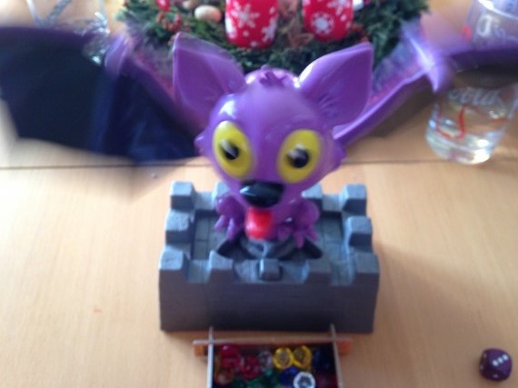 In „Flippi Flatter“ bewegen wir uns mit einem Würfel durch diverse Räume. Anschließend dürfen wir, einem Push-Your-Luck Spiel entsprechend, entscheiden, ob wir die Fledermaus 1 – 3-mal füttern möchten. Hierbei drücken wir auf seine Zunge. Bleibt er ruhig, erhalten wir Edelsteine als Belohnung. Flattert er wild auf und ab erschrecken wir uns so, dass wir einen Stein verlieren. Wer zuerst von jeder Sorte Steine 2 gesammelt hat, hat gewonnen. Für etwas Würze sorgen noch ein Teleporter- und ein Räuberfeld.