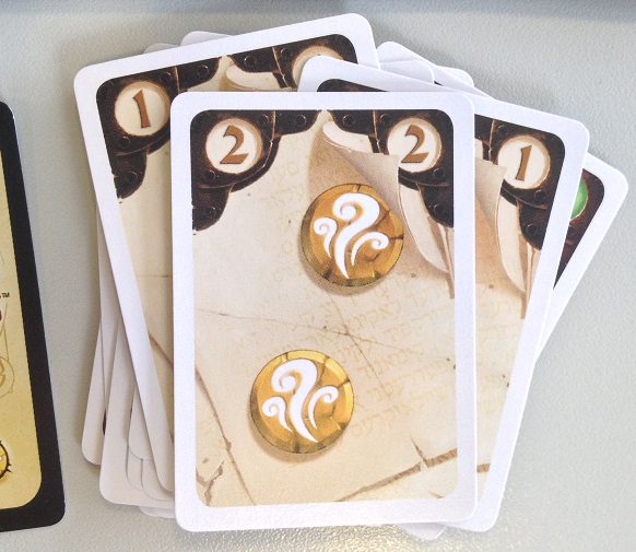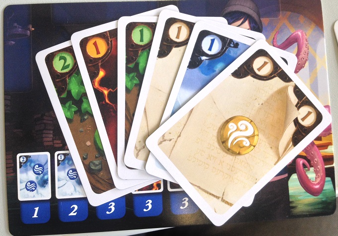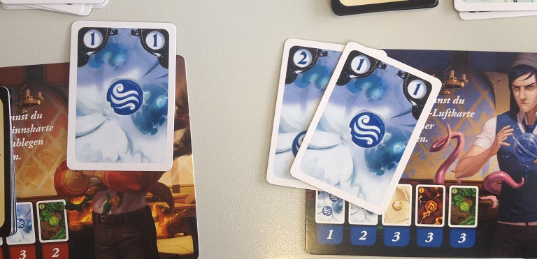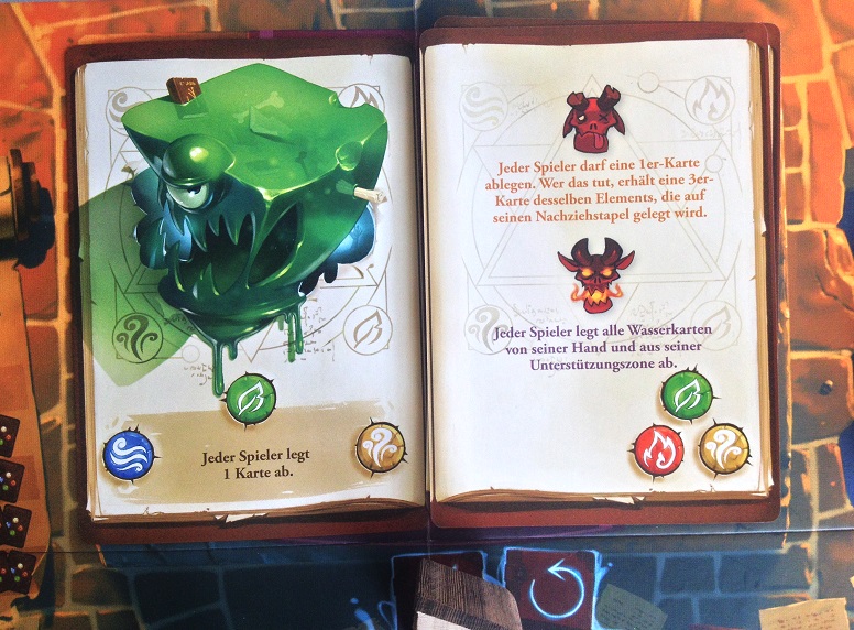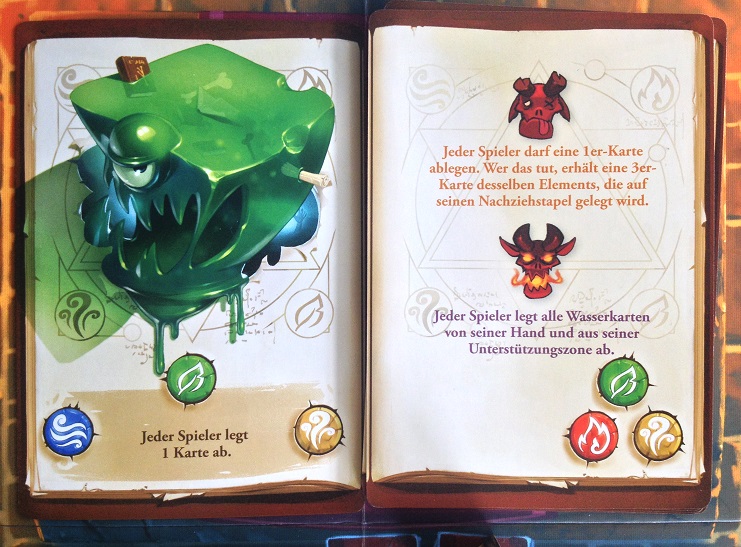 Dieses bestraft uns sofort, indem jeder Spieler bereits jetzt eine Karte ablege muss. Danach werden ein Wasser-, Erd- und Luftfluch platziert, die wir beseitigen müssen.