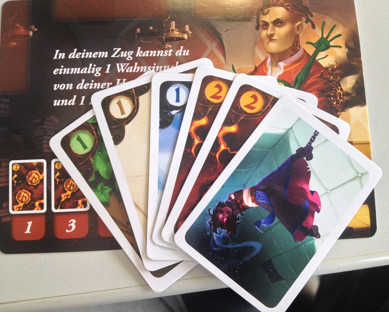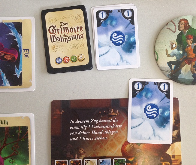 Das Thema hatten wir ja bereits angesprochen. Optisch ist es ein wahrlicher Leckerbissen. Seien es die schönen Zeichnungen oder der wandernde Rundenanzeiger in Form eines Buches. Auch die Idee, das Grimoire  des Wahnsinns mit Karten „nachzubauen“ und somit Seite um Seite umblättern zu können gefällt mir wirklich sehr gut. Aber das war es dann auch schon mit Thematik. Das Spiel selbst ist für mein Empfinden viel zu abstrakt. Ich (und meine Mitspieler) konnten einfach nie eintauchen. Ich fühlte mich nie, wie ein überforderter Zauberlehrling, der Versucht die Elemente unter seine Kontrolle zu bringen, sondern vielmehr, wie ein Farbensammler. Schließlich lässt sich das Spiel ja auch genau darauf reduzieren. Sammle 4 bestimmte Farben und wirf sie ab. Natürlich gibt es die Möglichkeit mit Unterstützungszonen und ähnlichem, aber dennoch hilft das der Thematik nicht sonderlich.