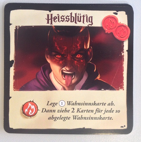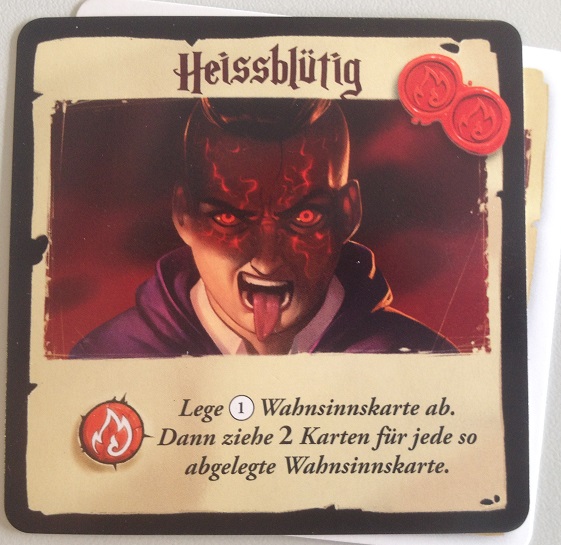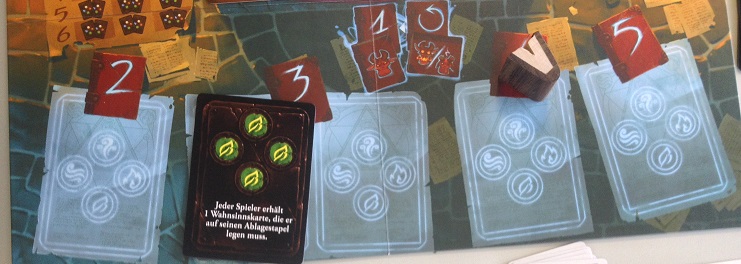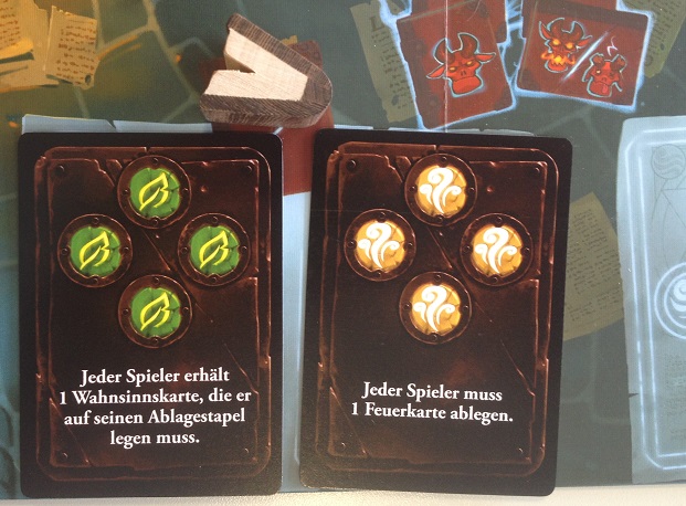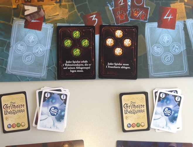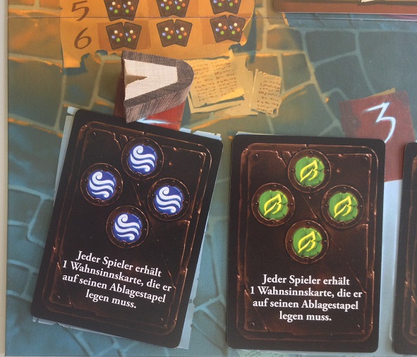 Für die abgeworfene Wahnsinnskarte ziehen wir ein 2er Erdelement und eine weitere Wahnsinnskarte.