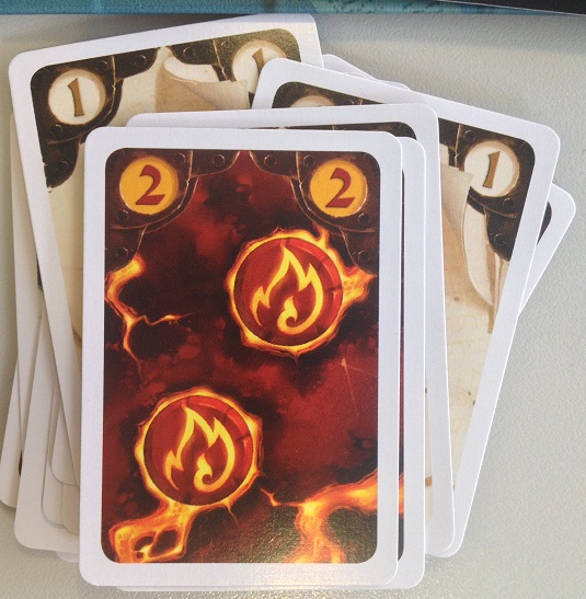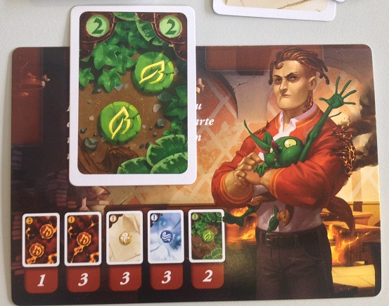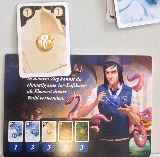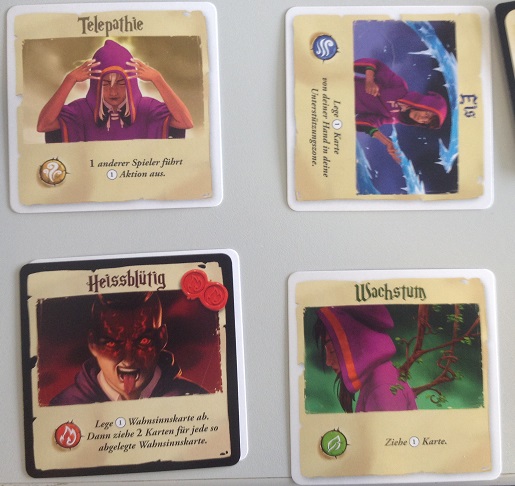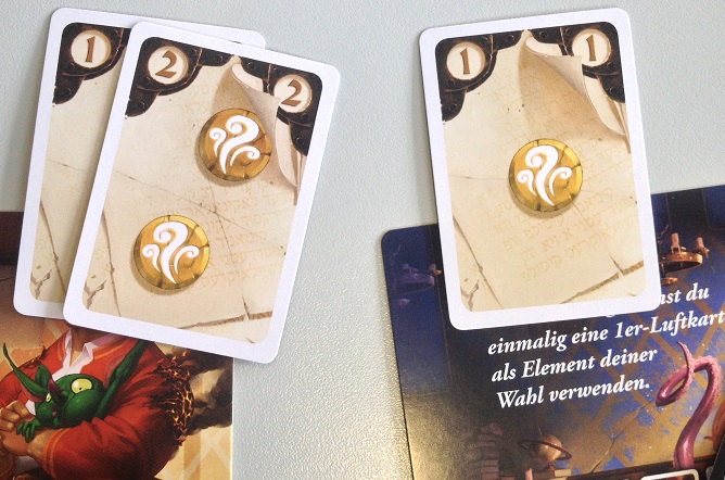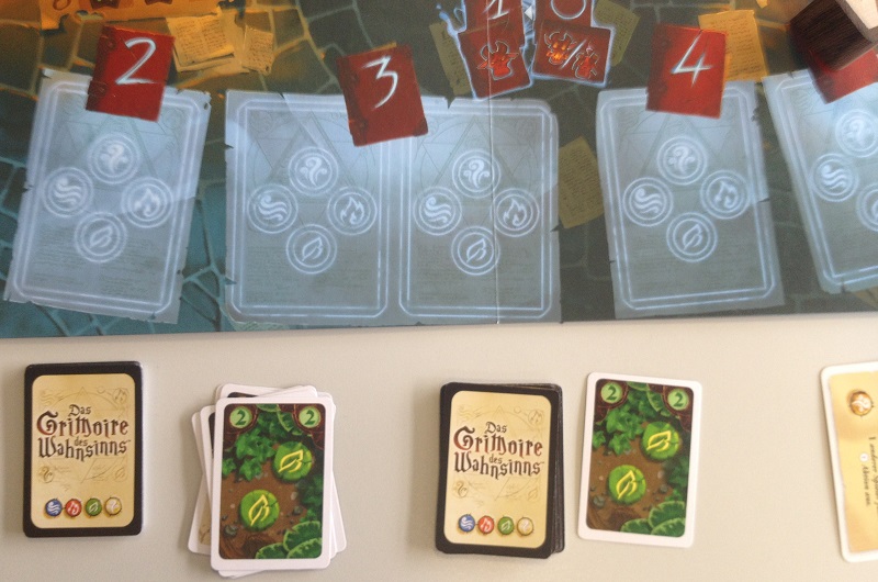 Nachdem jeder seine Wahnsinnskarten bekommen und eine Feuerkarte abgelegt hat legt der Zauberlehrling 2 Erdelemente ab. Hierfür nimmt er sich dann ein passendes 2er Element, um sein Deck aufzubessern.