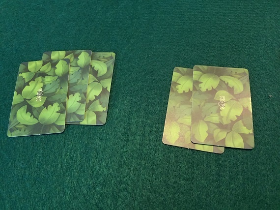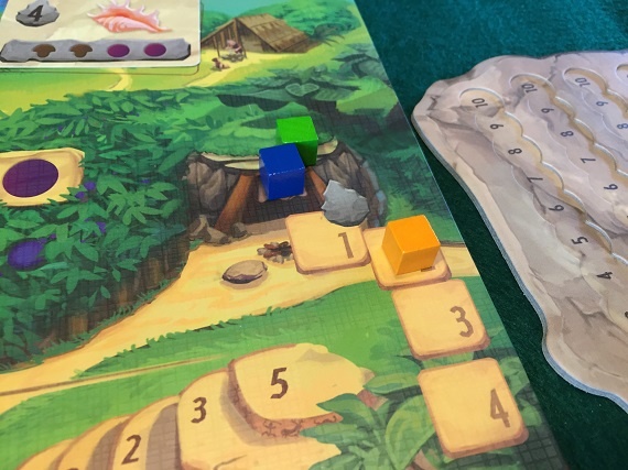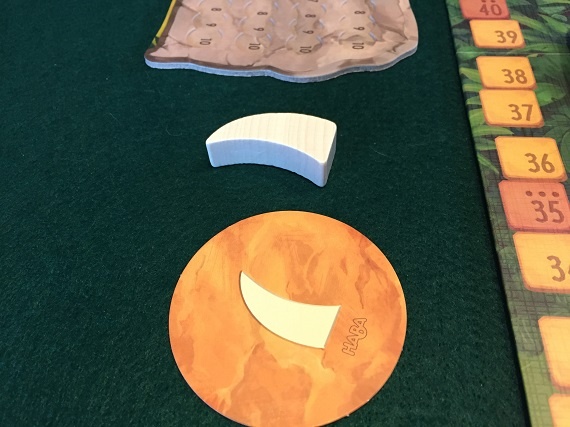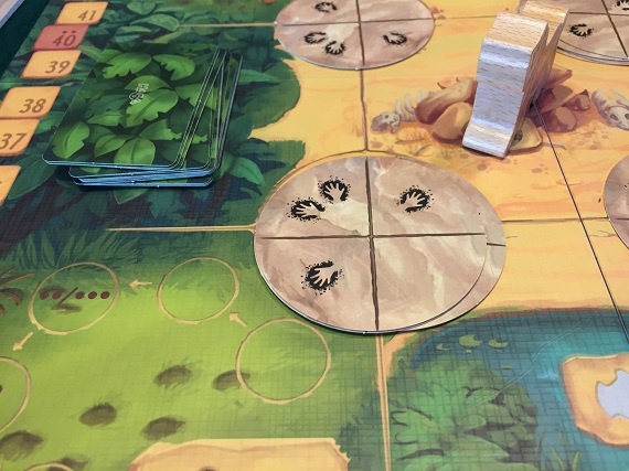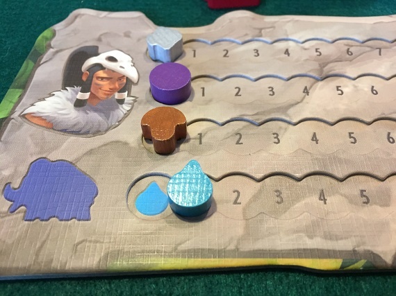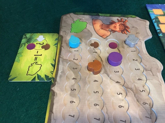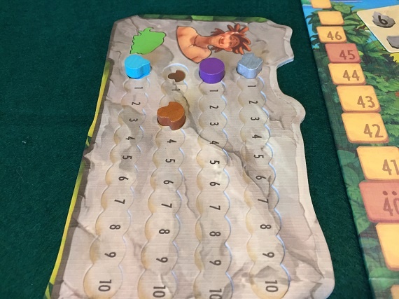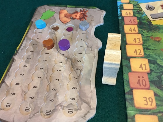 Die Tableaus haben wir ausnahmslos gut gefallen. Die Kerben sorgen dafür, dass die Marker an Ort und Stelle bleiben. Letztere wären mir persönlich in komplett runder Form jedoch lieber gewesen. Ja, die Holz-Teile sehen als Fisch, Pilz und Wassertropfen besser auf, jedoch macht es sie nicht unbedingt leichter zu fassen.