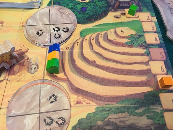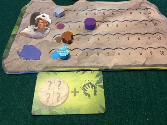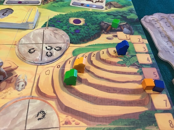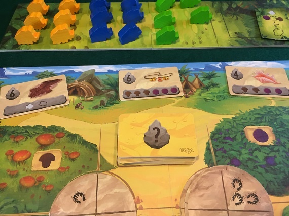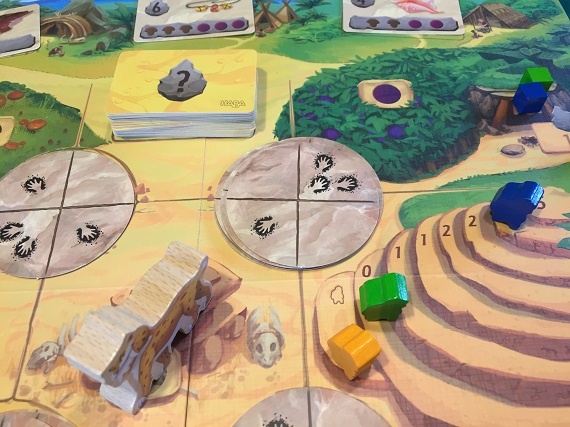 Ist man in „Honga“ am Zug, muss man sein rundes Arbeiter-Plättchen einsetzen. Die darauf befindlichen Hände bestimmen dann, wie häufig die Aktion ausgeführt werden darf, zu der sie zeigen. So erhält man Rohstoffe, darf auf dem Tempelberg voranschreiben, am Markt handeln, Aktionskarten ziehen oder Mammuts platzieren. Doch man sollte sich auch um Honga im Zentrum des Plans kümmern. Denn, zeigt keine Hand zu ihm, kommt er in unser Lager und frisst uns unsere Vorräte Stück für Stück weg.