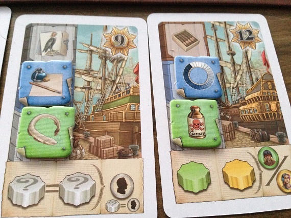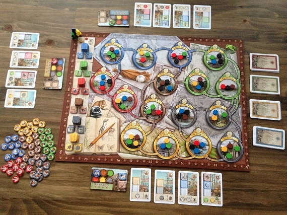 Das Spiel bedient sich dem Mancala-Grundprinzip. Genau, das alte Spiel, in dem wir Steine aus einer Schüssel nehmen und im Uhrzeigersinn auf andere Schalen verteilen. In „Humboldt’s Great Voyage“ nutzen wir es um Orte zu bereisen, Waren zu sammeln und interessante Kontakte zu knüpfen. Entgegen dem Original ist hier jedoch etwas mehr Auswahl, was die Reiserichtung angeht. Jedoch kommt erschwerend hinzu, dass wir Farben passend bedienen sollten. Denn nur so erhalten wir Güter, mit denen wir Aufträge erfüllen können.