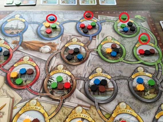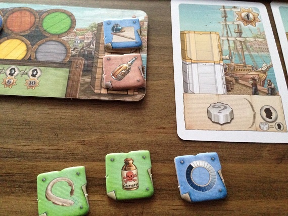Das entschädigt dann auch, dass danach recht offensichtlich ist, was zu tun ist. In neun von zehn Fällen ist es am besten die vollste Schale… äh… Stadt zu nehmen und die Steine so zu verteilen, dass ich möglichst viele Waren erhalte. Da die Pfeile die Richtungen relativ starr vorgeben, bleibt mir hier kaum Platz für spitzfindige Züge und Tricks. Das macht das Spiel geradlinig.