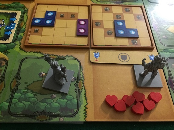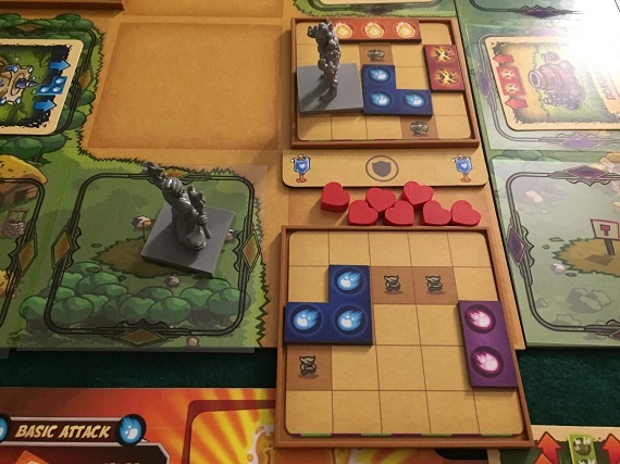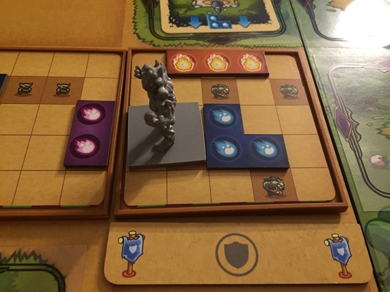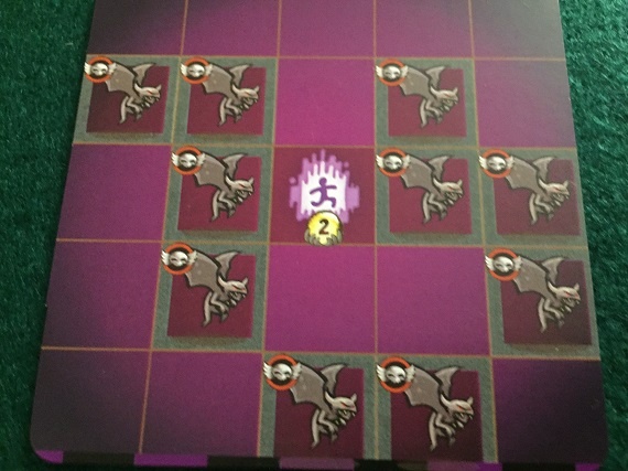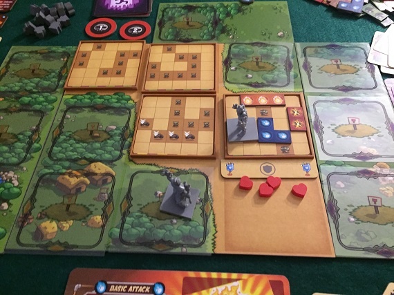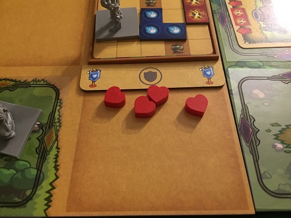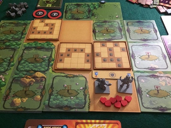 Wir konnten uns intensiv mit einem Prototypen beschäftigen, der die ersten drei Level des fertigen Spiels enthält. Dabei fungierten die ersten zwei Stufen wie eine Art Tutorial. Erst im letzten Szenario spielen wir das komplette Spiel mit allen Regeln. Und auch, wenn es im obigen Bilderbeispiel anders aussah, haben wir alle drei Szenarien mit Bestwertung (alle sieben Lebenspunkte blieben nach dem Sieg über die Monster übrig) bewältigt. Eine Musterlösung hätte euch nur ein Teil des Spiels gezeigt, so, dass wir uns dafür entschieden haben, uns etwas blöd zu stellen.
