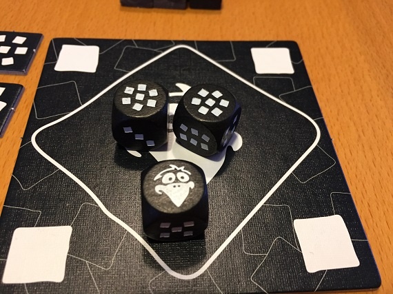 Die Würfel mit der Sieben wandern wieder aufs Brett. Unser Zug endet nun, da wir mindestens viermal die gewählte Zahl gesammelt haben.