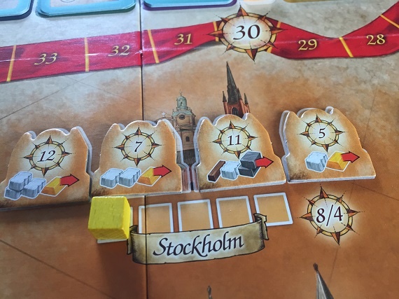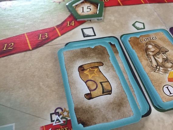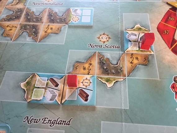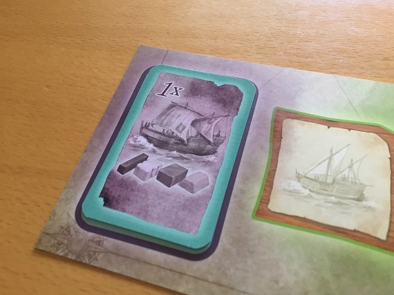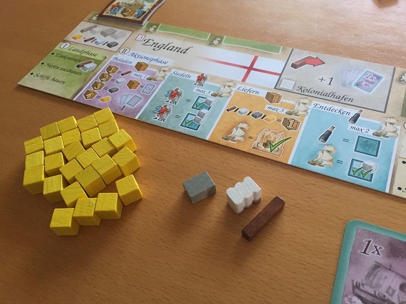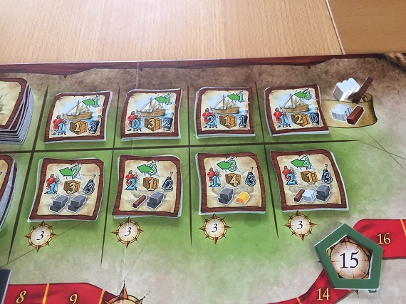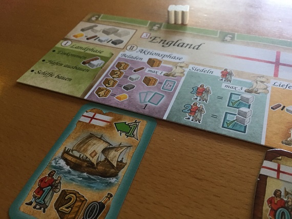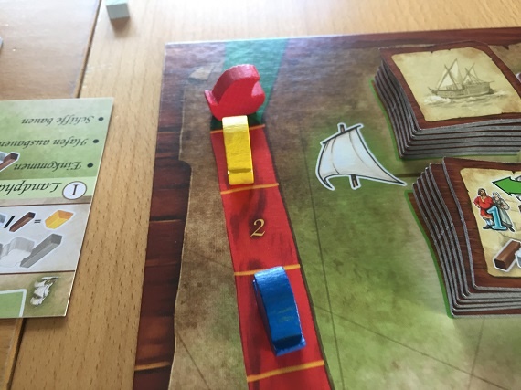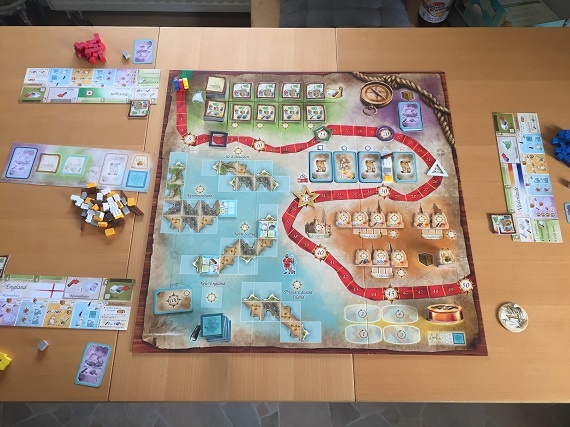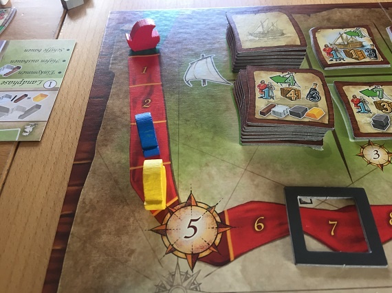 Auch die Folgepartien wirkten allesamt recht blutleer und stimmungslos. Klar, es gibt mehrere Wege und die Mechanismen selbst funktionieren, aber die Komposition stillt dann doch nicht den Hunger. Das Spiel wirkt vollkommen abgeschliffen, so sehr, als ob man einfach jedem gefallen wollte. Dabei gibt es Mechaniken, die ich eigentlich mag. Die oben erwähnten Markierungen der Siegpunktleiste sind ein Merkmal die „Race to the new found Land“ zu etwas Besonderem machen sollten. Doch im Spiel selbst fügen sie sich einfach ins Gesamtbild, ohne großartig Spannung auszulösen. Man spielt gemütlich vor sich hin, ohne ein genaues Ziel zu verfolgen. Schließlich weiß man auch nie wann man welche Auftragskarten erhalten könnte, was dann wie eine kleine Irrfahrt durch neblige Gewässer wirkt. Man hat kein genaues Ziel vor Augen, sondern spielt einfach darauf los.