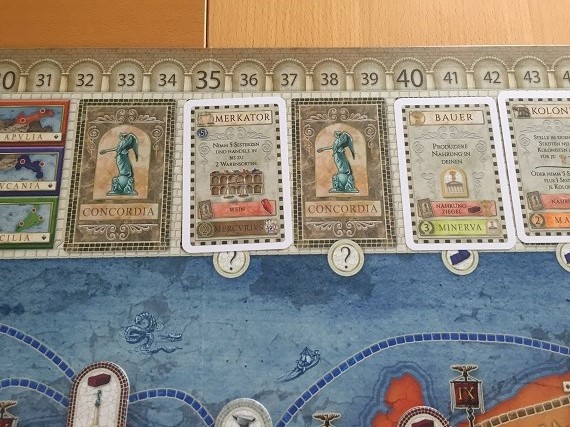 Die Siegpunkte sind zu Beginn nicht richtig zu fassen. Auch Profis werden mit fortgeschrittenen Spielen nicht immer die vollkommene Kontrolle behalten. Das mag dem ein oder anderen nicht liegen. Schließlich hat man während des kompletten Spiels keinerlei Überblick, wer sich wie gut schlägt. Auch man selbst kann sich nur rudimentär einschätzen, wodurch es am Ende immer wieder zu Überraschungen kommt. Aber das übt auf mich auch einen gewissen Reiz aus. Kein Punktesalatbuffet während des Spiels, bei dem genau abgewogen wird, welches Häppchen einen nun doch einen halben Schritt weiter bringen dürfte. Concordia zwingt einen hier schon fast aus dem Bauch heraus zu spielen und wie ein Geier über passenden Karten zu kreisen.