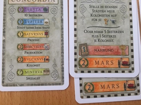 Für mich ist Concordia ein sehr gelungenes Aufbauspiel. Friedlich und voller interessanter Entscheidungen und Möglichkeiten, wodurch es selbst nach vielen Partien immer noch seinen Charme entfalten kann. Schade nur, dass sich auf den deutschen Abrechnungskarten ein kleiner Fehler eingeschlichen hat. Hier wurde der Gott Mars als Vulcanus tituliert. Aber das stört einen spätestens nach einer halben Partie nicht mehr, wenn man sich daran gewöhnt hat.