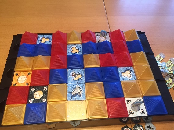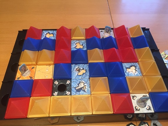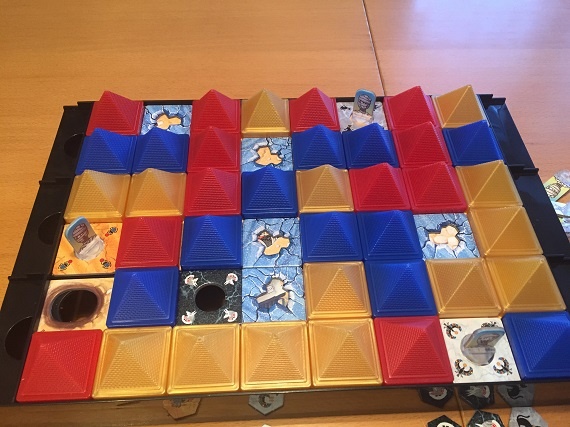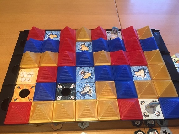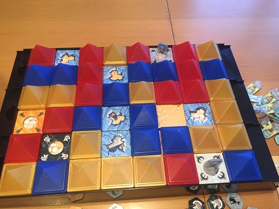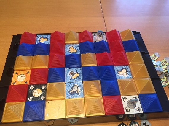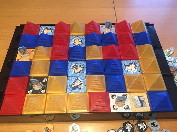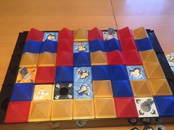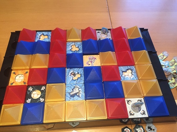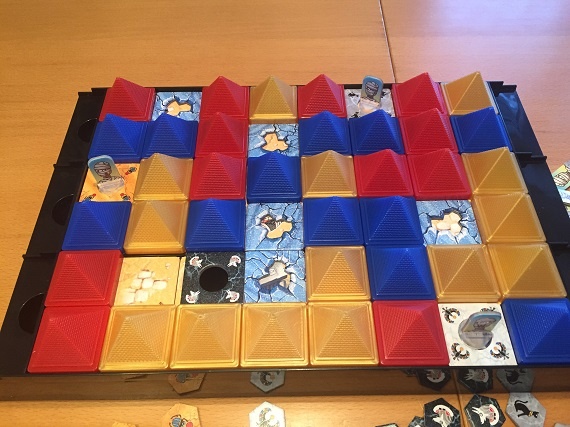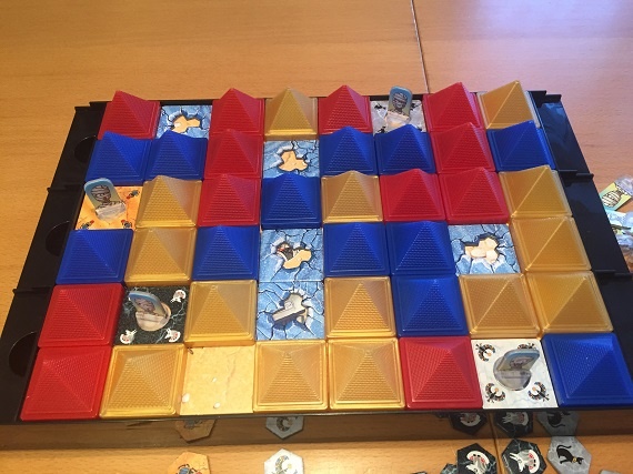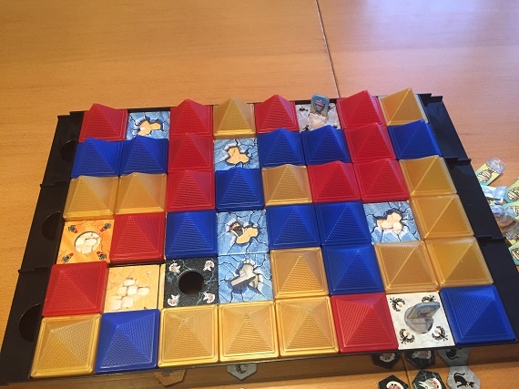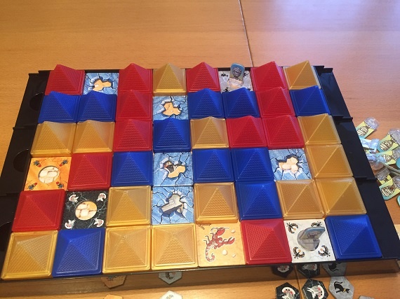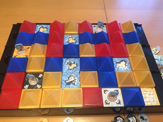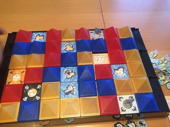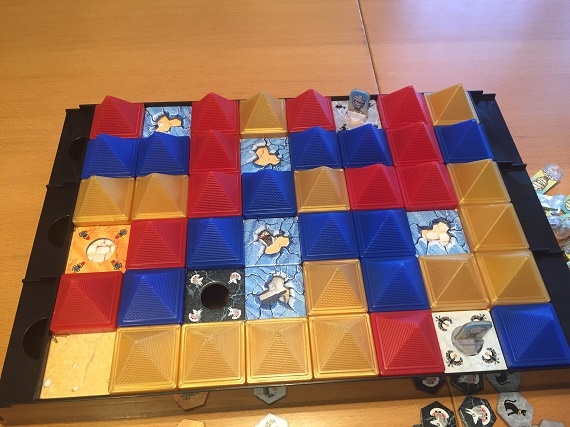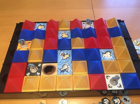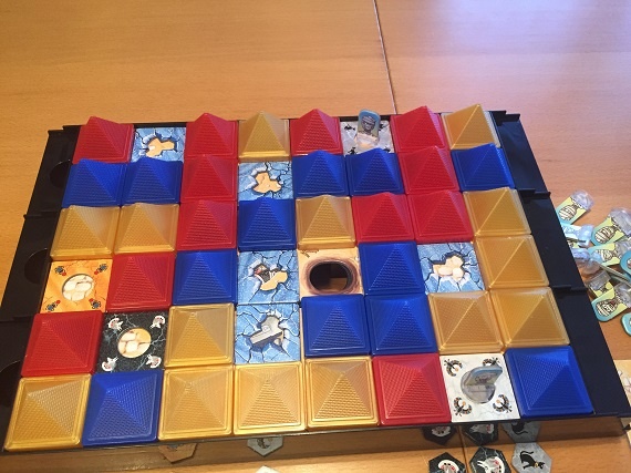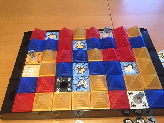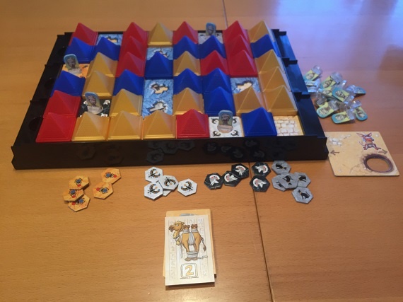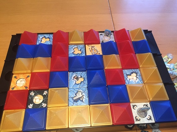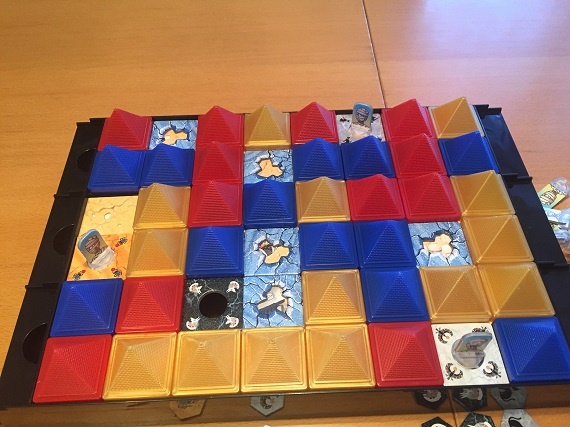 Einzig der Einstieg in jede Partie ist etwas holprig, was daran liegt, dass man erst Schritt für Schritt sieht, was sich unter den einzelnen Pyramiden verbirgt. Das macht den Beginn des Spiels auch eher zu einem Glücksspiel, als zu einer Herausforderung. Schließlich weiß zu diesem Zeitpunkt niemand, wo sich was befindet. Nur ein paar Löcher in den Fliesen geben zu wenige Informationen preis. Von Zug zu Zug lernt man immer mehr hinzu, ist sich aber nie zu 100 % sicher. Einen Zustand, den sich „Die Mumien des Pharao“ mit Memory teilt. Zusätzlich passiert es jedoch regelmäßig, dass eine neue Platte eingeschoben wird und sich eine Reihe dadurch verändert. Gut für den, der Umdenken kann.