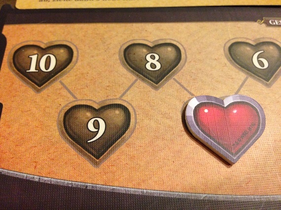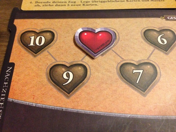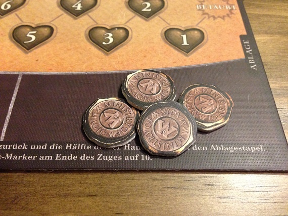 Das Material selbst ist von extrem schwankender Qualität. Von genial (die Metall-Marker) bis hin zu unterirdisch ist alles dabei. Letzteres betrifft vor allem die Karten. Diese wirken billigst produziert. Ich habe das Gefühl, dass Kosmos hier die Produktionsstätte von USAopoly verwenden musste. Anders kann ich mir das kaum erklären. Ein paar der Karten sehen aus, als ob der Kleber nicht richtig hält. Dadurch wirken diese Karten, als ob längliche Luftblasen darin gefangen wären. Außerdem ist nach sieben Partien bereits ein eindeutiger Abrieb zu erkennen.