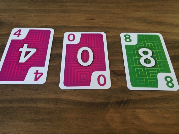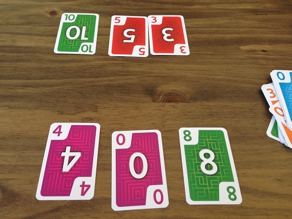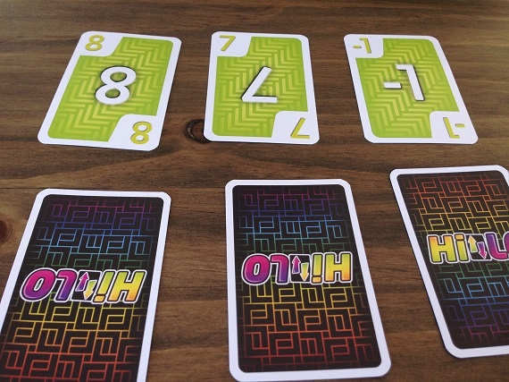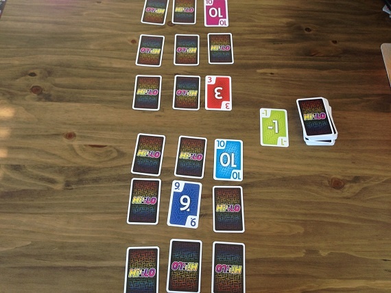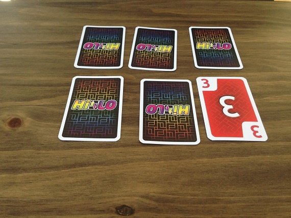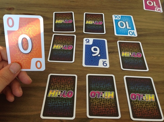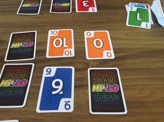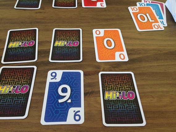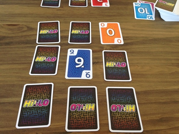 In „HILO“ hat jeder Spieler ein Raster aus 3×3 Karten vor sich liegen. Am Zug nimmt man die oberste Karte vom Ablage- oder Nachziehstapel und tauscht Karten mit seiner Auslage, mit dem Ziel am Ende mit möglichst wenigen Punkten da zu stehen. Optimal ist, wenn wir eine gleichfarbige Reihe oder Spalte hinbekommen. Denn diese Karten werden aus unserer Auslage entfernt. Eine Runde endet, wenn alle Karten eines Spielers offen liegen.