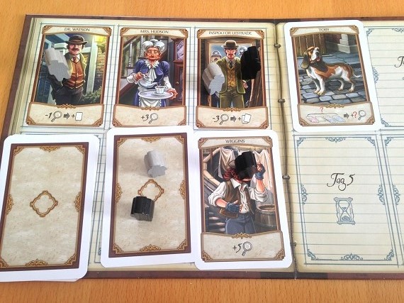 Man sollte sich zuerst einmal bewusst werden, dass „Holmes“, trotz der damit verbundenen Thematik, eben kein deduktives Spiel um einen Fall ist. Wir haben hier ein reines Worker-Placement und Mehrheitenspiel vorliegen. Was nicht enttäuschend ist, jedoch überraschend. Natürlich hätte man hier jegliche andere Thematik über das Spiel stülpen können. Ob man nun Früchte, Werkstoffe, Hinweise, Bücher, Dinosaurierknochen, etc. sammelt wäre spielerisch gesehen vollkommen egal. Jedoch ist „Holmes“ von der Aufmachung sehr gut gelungen. Es wurde auch auf kleine Details geachtet, wie zum Beispiel die Rückseite des Spielplans beweist. Das sind optische Reize, auf die ich voll anspreche!