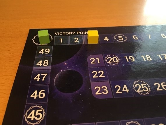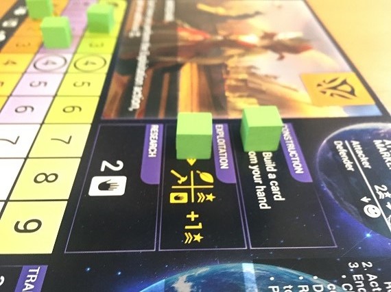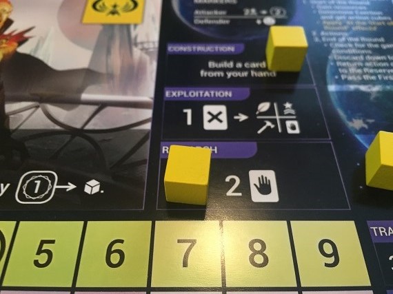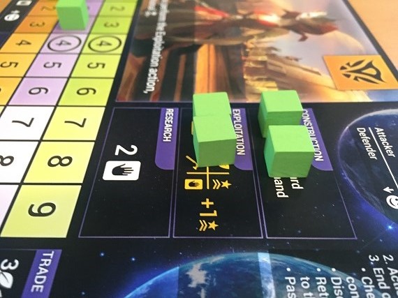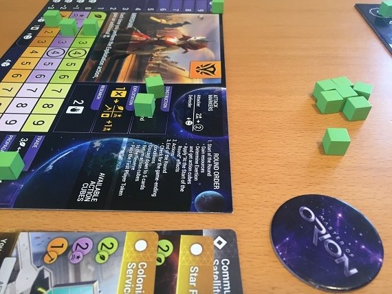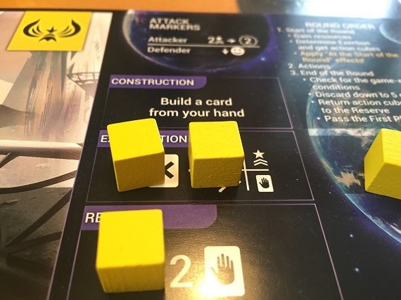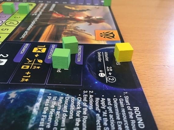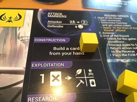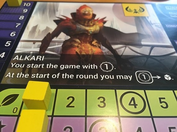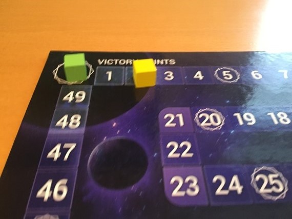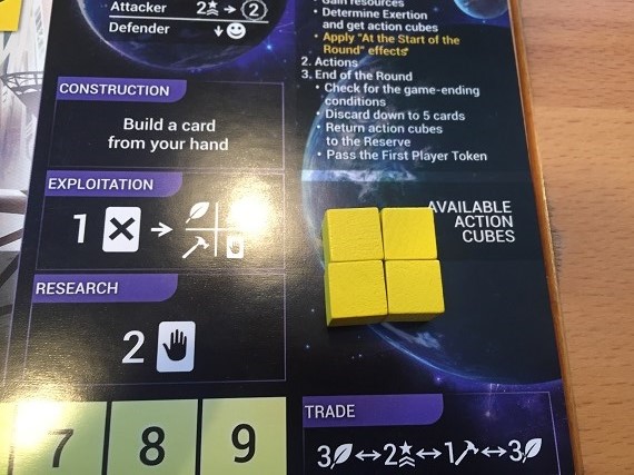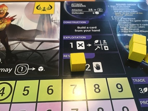Zusätzlich bietet unsere Alienrasse einen Vorteil. Wir dürfen 1 Siegpunkt ausgeben, um einen zusätzlichen Aktionswürfel zu erhalten.
