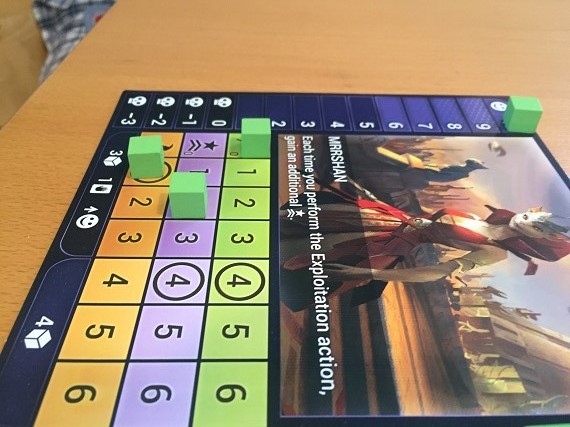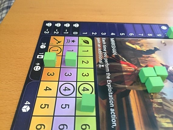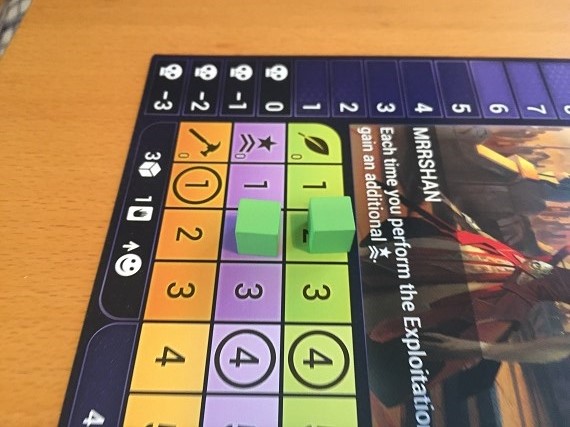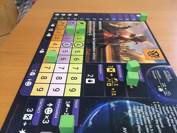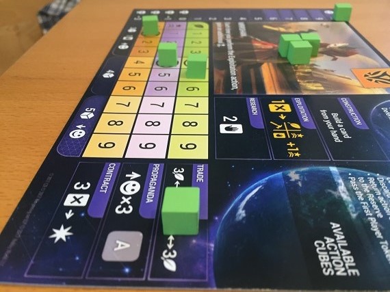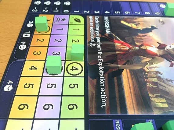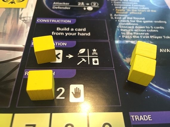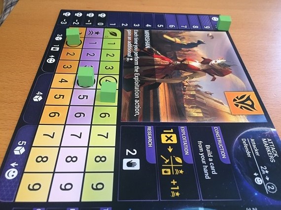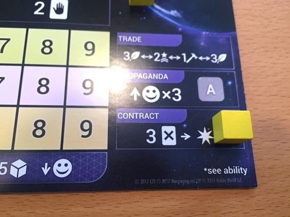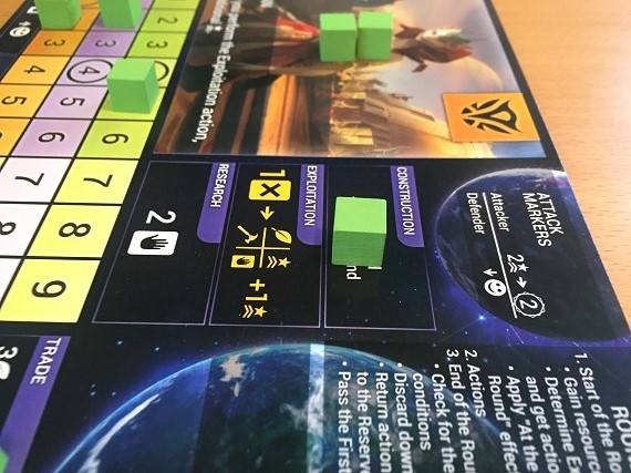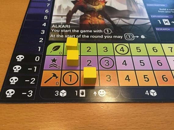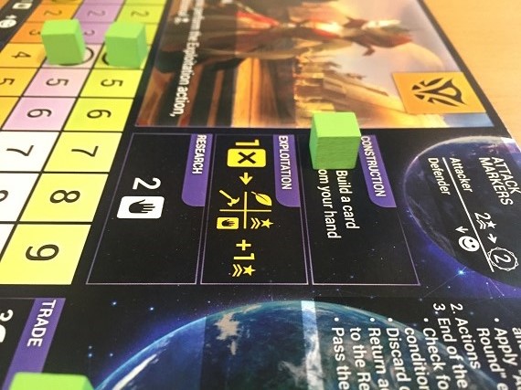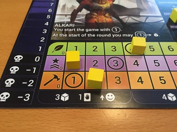 Zusätzlich bietet unsere Alienrasse einen Vorteil. Wir dürfen 1 Siegpunkt ausgeben, um einen zusätzlichen Aktionswürfel zu erhalten.