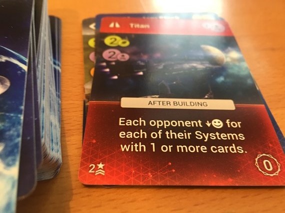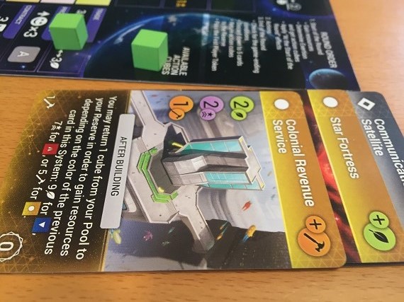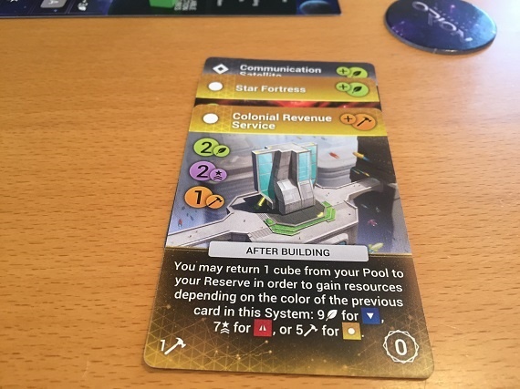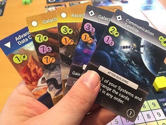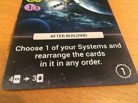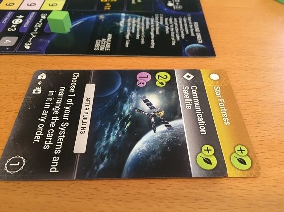 Er legt eine seiner Handkarten aus. Insgesamt stehen 4 Systeme (Kartenreihen) zur Verfügung, in die wir bauen dürfen.