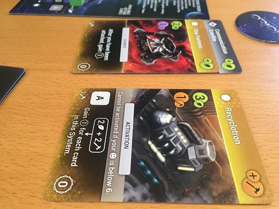 Und wir müssen 2 Flotte abgeben. Erneut sind keine Aktionswürfel mehr verfügbar, die Runde ist vorbei. Das Spiel endet nach 8 Runden, wenn ein Spieler am Ende der Runde auf 0 Moral ist oder ein Spieler seine kompletten Systeme ausgebaut hat. Zuletzt erhalten die Spieler noch Punkte für ihre gebauten Gebäude. Es gewinnt der Spieler mit den meisten Punkten.