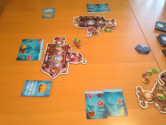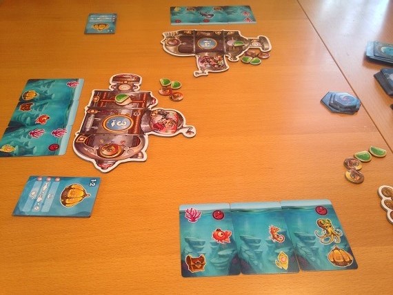 In „Oceanos“ begeben wir uns in selbst gebauten U-Booten bis an den Grund des Meers. Dieses baut dabei jeder Spieler Runde um Runde immer weiter für sich selbst aus. Doch nur, wer sein Schiff stetig verbessert, genügend Meeresbewohner sammelt und Schätze hebt wird zum Schluss den Sieg davontragen können.