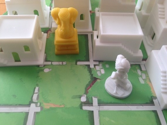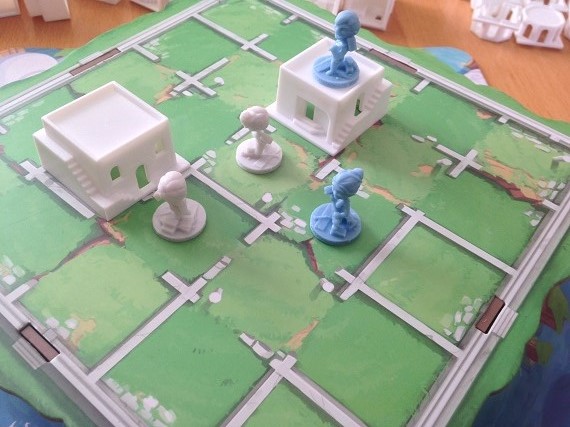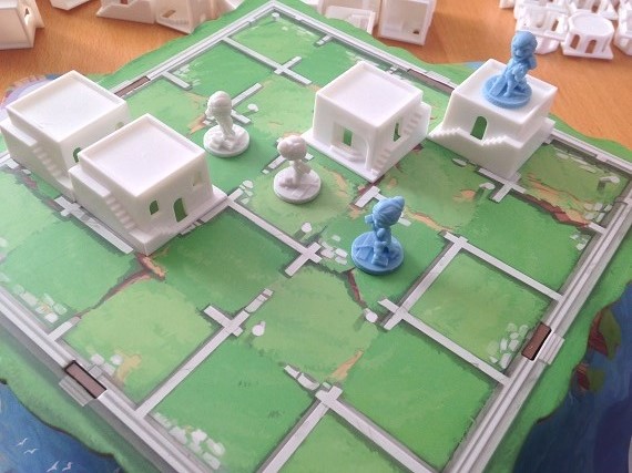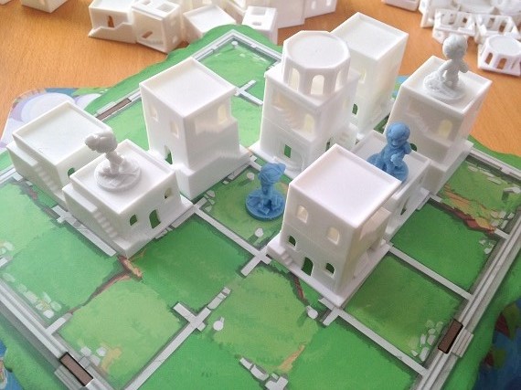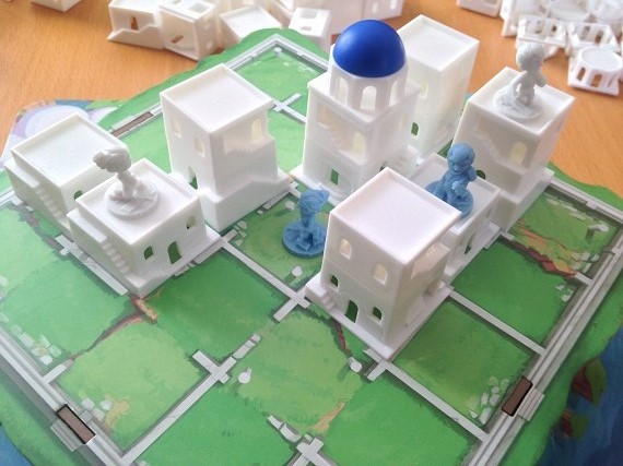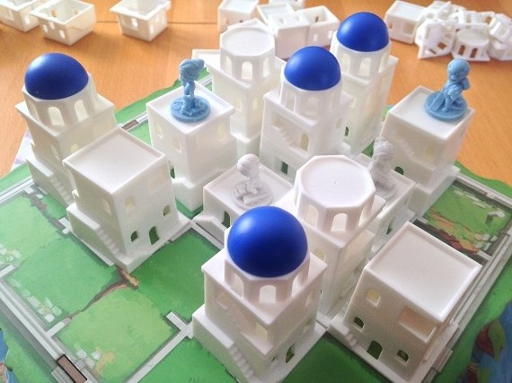 Zuallererst springt einen bei „Santorini“ natürlich das tolle Design an. Schön gezeichnete Charaktere, 3D-Gebäude, ein in die Höhe ragender Spielplan und nette kleine Handwerkerfiguren, die einen im Spiel begleiten. Alles sieht wirklich toll aus. Die Ernüchterung folgt jedoch auf den Fuß. Denn eigentlich handelt es sich bei „Santorini“ um ein rein abstraktes Spiel. Im Endeffekt hätte man hier jedes andere Thema darüberstülpen können. Genauso gut kann man es einfach entfernen. Es funktioniert danach genauso gut, wie mit griechischer Mythologie.