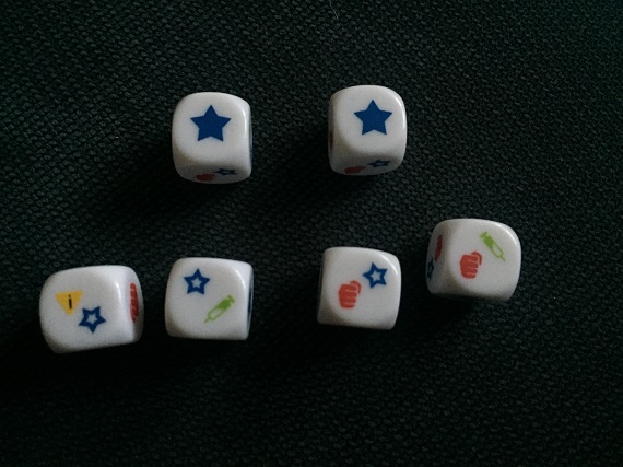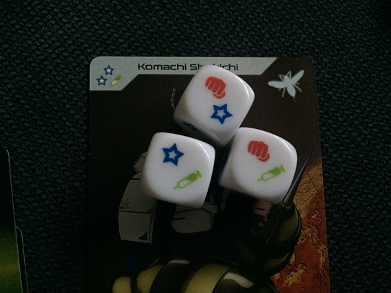 Wir treten in „Terra Formars“ alle gegeneinander an. Während wir mit dem Begleitheft versuchen herauszufinden, was die einzelnen Karten können, verwenden wir Kampfwürfel um Ausrüstung oder Unterstützung zu kaufen, Spezialaktionen auszulösen und den Schaben so richtig eins auf die Zwölf zu geben. Besiegen wir sie erhalten wir Siegpunkte und unsere Kollegen Bonusplättchen. Ist keine Schabe mehr zum Nachfüllen da, gewinnt derjenige das Spiel der die meisten Siegpunkte durch diese Monstrositäten sammeln konnte.