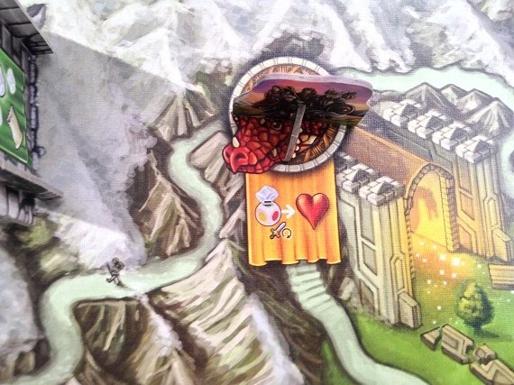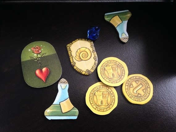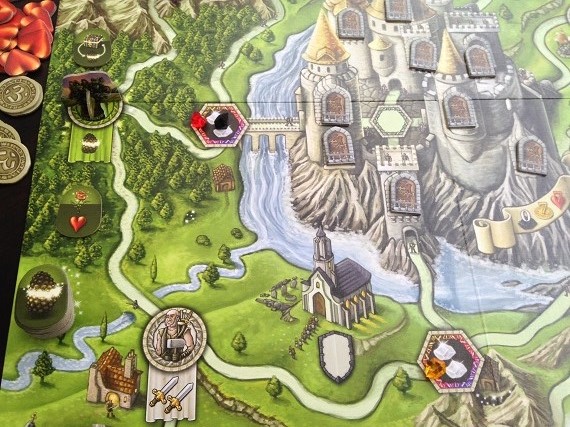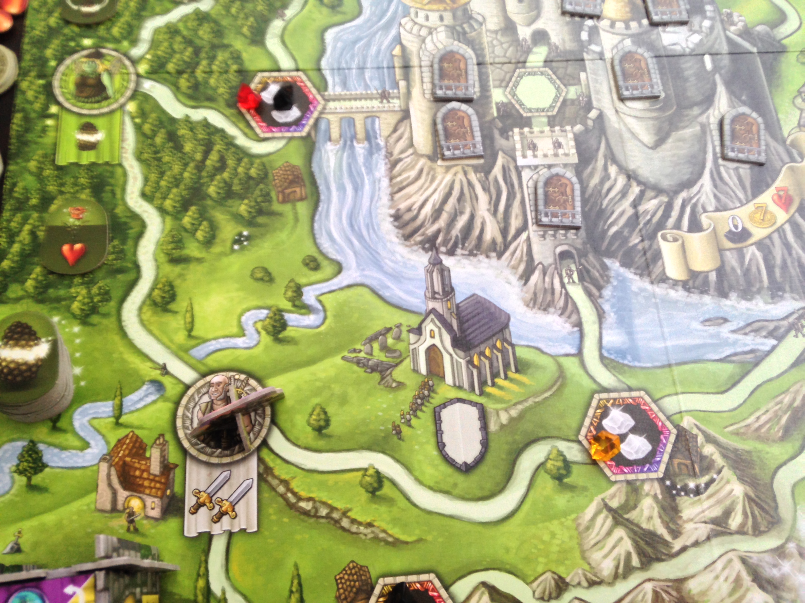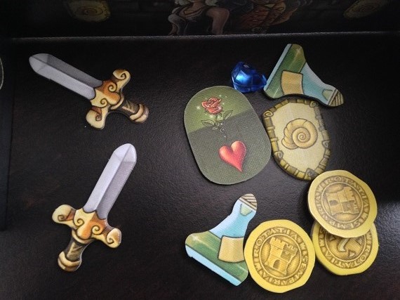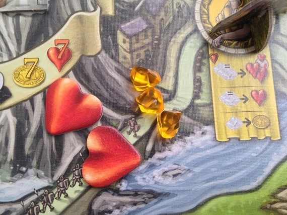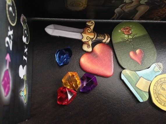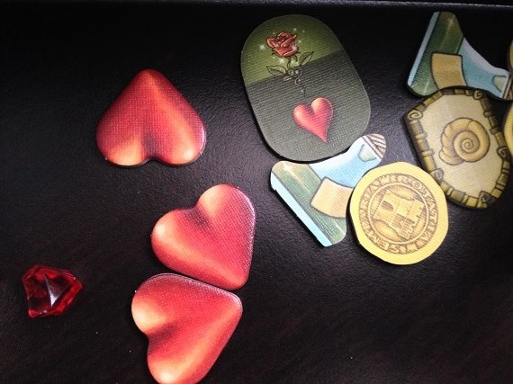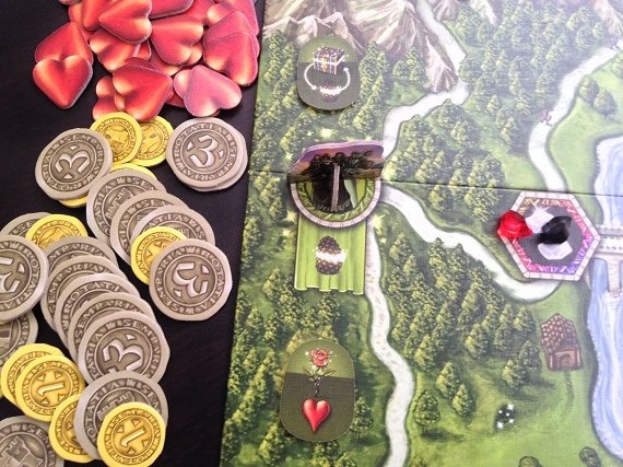 In Touria teilen sich alle Spieler eine Figur. Die Heldengruppe. Mit dieser ziehen sie durch das Land. Der Clou dabei ist, dass man nicht jederzeit alle Aktionen zur Verfügung hat. Je nach Stellung der vier Türme hat man Zugriff auf verschiedene. Ziel ist es diese Aktionen zu nutzen, um 7 Herzen und 7 Gold zu sammeln und dann die Gemahlin/den Gemahl zu finden. Aber nur ohne schwarze, verfluchte Edelsteine im Gepäck.