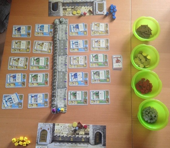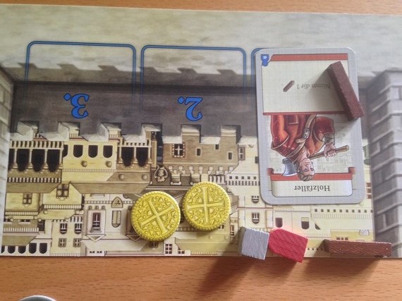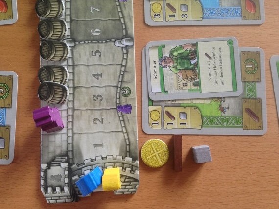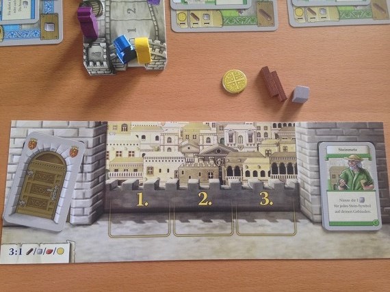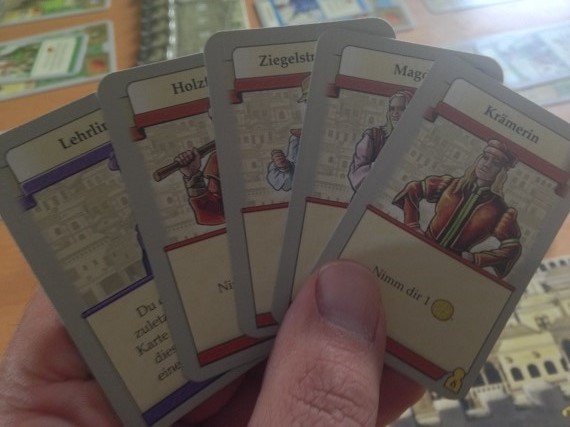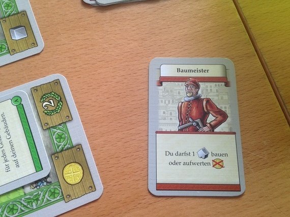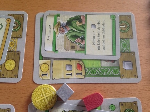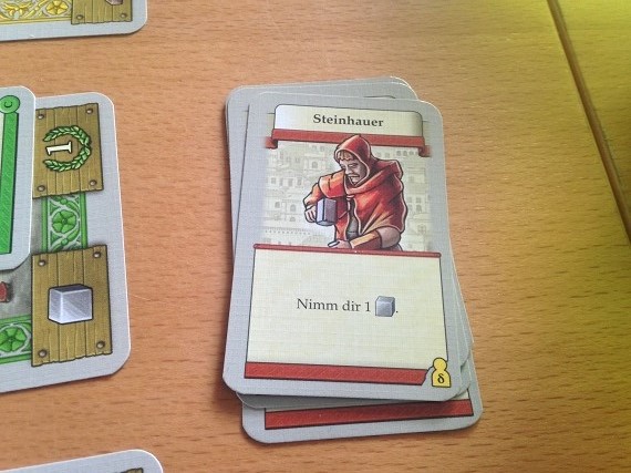 Ja, es gibt viele Gebäude, von denen man im ersten Spiel nicht alle zu sehen bekommt. Aber für ein Deckbau Spiel ist dann doch zu wenig Varianz drin. Im Endeffekt haben wir zu jedem Rohstoff eine Möglichkeit diesen zu erwerben, einen Baumeister, der bestimmte Rohstoffe beim Bau spart und Belohnungskarten, die Siegpunkte für bestimmte Gebäude generieren. Dann noch ein paar Varianzen dazwischen und das war es. Hier wäre mehr schön gewesen. Kein absolutes Muss, aber eben schön. Aber so gibt es zum Glück keine übermächtigen Karten, die Kombinationen erlauben, die nicht einholbar sind. Es ist alles einfach etwas bodenständig.