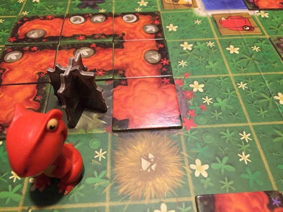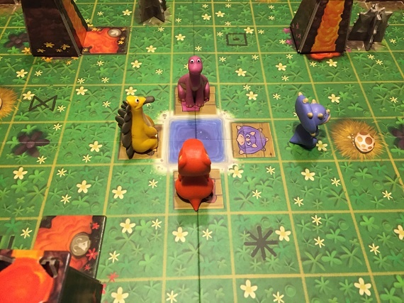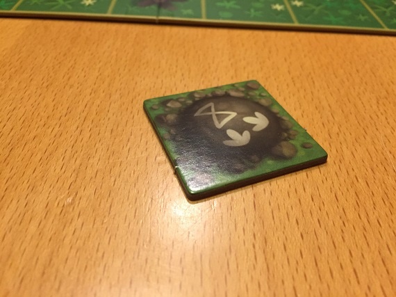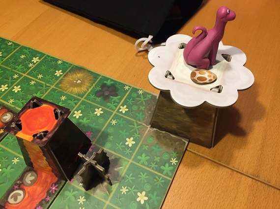 Über gezogene Plättchen steuern wir in „SOS Dino“ den Verlauf der Lava, welche aus den Vulkanen strömt. Gleichzeitig geben sie die Bewegung vor, die wir in diesem Zug durchführen dürfen. Kommt ein Dino dabei auf eines der Eckfelder, ist er gerettet. Doch auf dem Weg liegen auch Eier, die man nicht ihrem Schicksal überlassen sollte. Sind keine Dinos mehr im Spiel oder der Nachziehbeutel leer, wird abgerechnet. Die erreichte Punktzahl zeigt uns dabei, wie gut wir uns geschlagen haben.