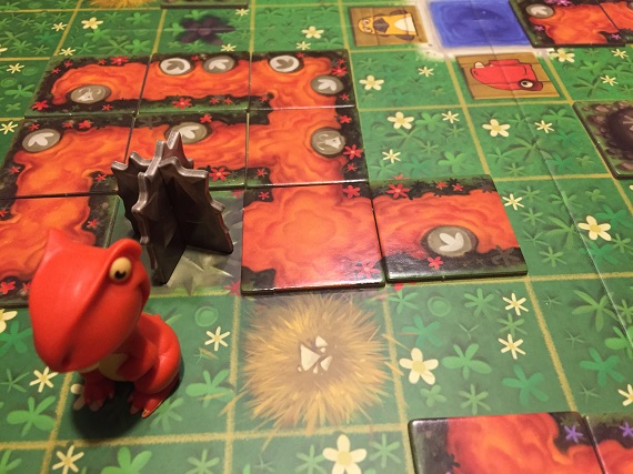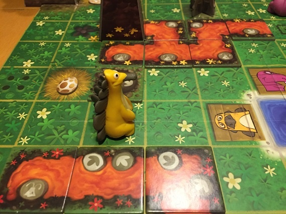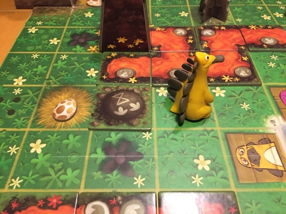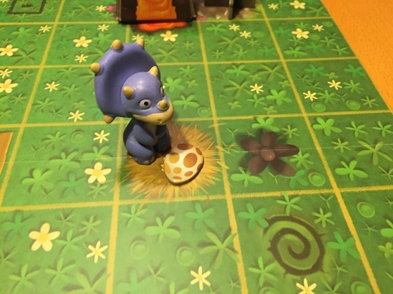 Sind wir im „Obstgarten“ dem Würfel auf Getreu und Verderb ausgeliefert, sind wir in „SOS Dino“ unseres eigenen Glückes Schmied. Es ist sozusagen die nächste evolutionäre Stufe des Spielerlebens. Kinder müssen sich hier mit Wegfindung und -planung auseinandersetzen. Vorausschauend agieren, ohne übertrieben Vorausplanen zu müssen.
