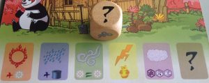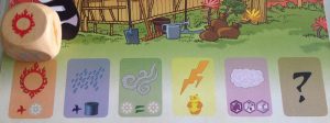 Ab der zweiten Runde wird der Wetterwürfel geworfen. Wir erhalten das Fragezeichen, wodurch man sich ein Ergebnis aussuchen darf. Am besten passt uns das Regenwetter.
