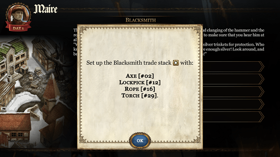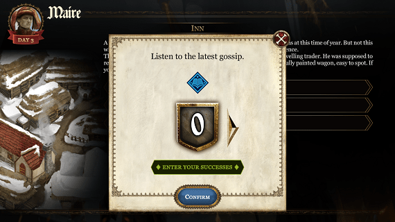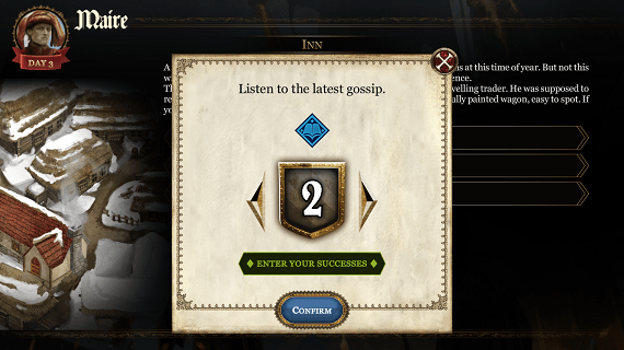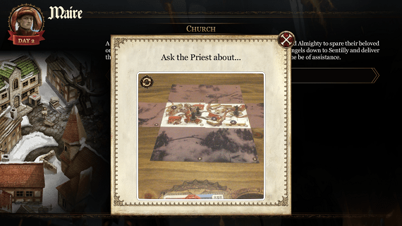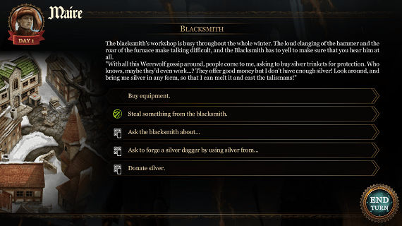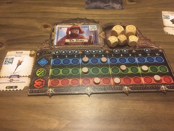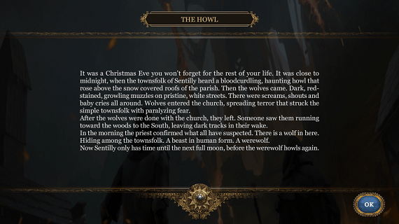 In der uns vorliegenden Beta-Version ist das Szenario „The Howl“ enthalten. Es bietet eine erwachsene Fantasy Geschichte, die auch mal etwas düster sein darf. Grundlage ist kein langweiliges „ihr müsst die Welt retten“ Szenario, sondern eine persönliche Geschichte einfacher Menschen. Unser Dorf wurde von Wölfen angegriffen und der Priester ist sich sicher, dass ein Werwolf sein Unwesen treibt. Das ist die Bühne, die die drei Protagonisten betreten, die wir steuern können. Toll ist, dass jeder von ihnen ein eigenes Ziel hat, welches er verfolgt. Diese überschneiden sich, stehen entgegen der Ziele anderer Spieler, so dass ein gewisser Wettlauf entsteht. Spätere Runden, in denen wir alle wussten, wer welche Aufgabe hatte, fühlten sich zwar anders an, aber nicht wegen der offenen Ziele. Kann aber auch am Szenario gelegen haben. Je überraschender die Ziele, desto mehr leidet das Spiel wahrscheinlich an offenen Informationen.