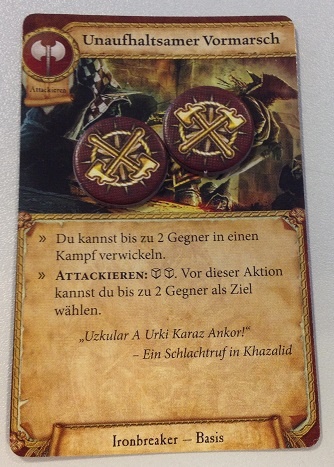 Schade ist nur, dass bei Warhammer Quest keine Spielerbezogene Skalierung stattfindet. Okay, fast keine. Die Helden haben mehr Lebenspunkte und haben bei zwei Spielern den Vorteil, dass sie Doppelaktionen durchführen dürfen. Aber die Anzahl der Gegner bleibt immer gleich. Kann man diese auf mehr Schultern verteilen werden sie schneller fallen, denn trotz Doppelaktion kann man einen erschöpften Angriff nicht sofort wieder verwenden.