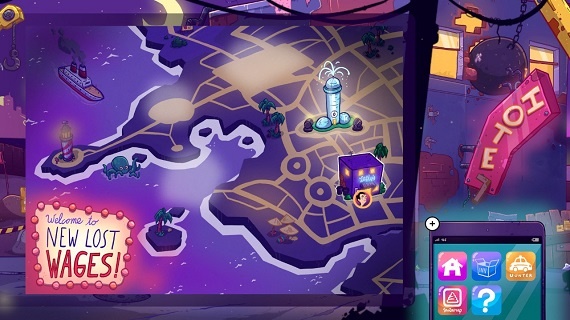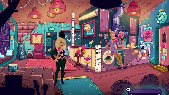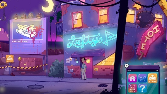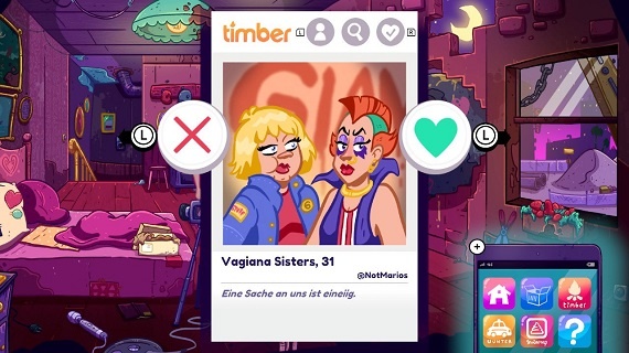 In seinem neuesten Abenteuer auf der Switch, können wir Larry wahlweise per Touch oder linken Analogstick steuern. Mit dem rechten Stick bewegen wir einen Mauszeiger auf dem Bildschirm. Wie in Adventures üblich führen wir viele Gespräche mit den Charakteren, denen wir begegnen. Gegenstände, die wir unterwegs finden stecken wir ein und können sie etwas umständlich über unser Inventar kombinieren oder mit der Umgebung benutzen. Kurz nach Beginn erhält Larry ein Smartphone über das er dann vorwiegend die Dating App „Timber“ und den Fahrdienst „Unter“ bedient.